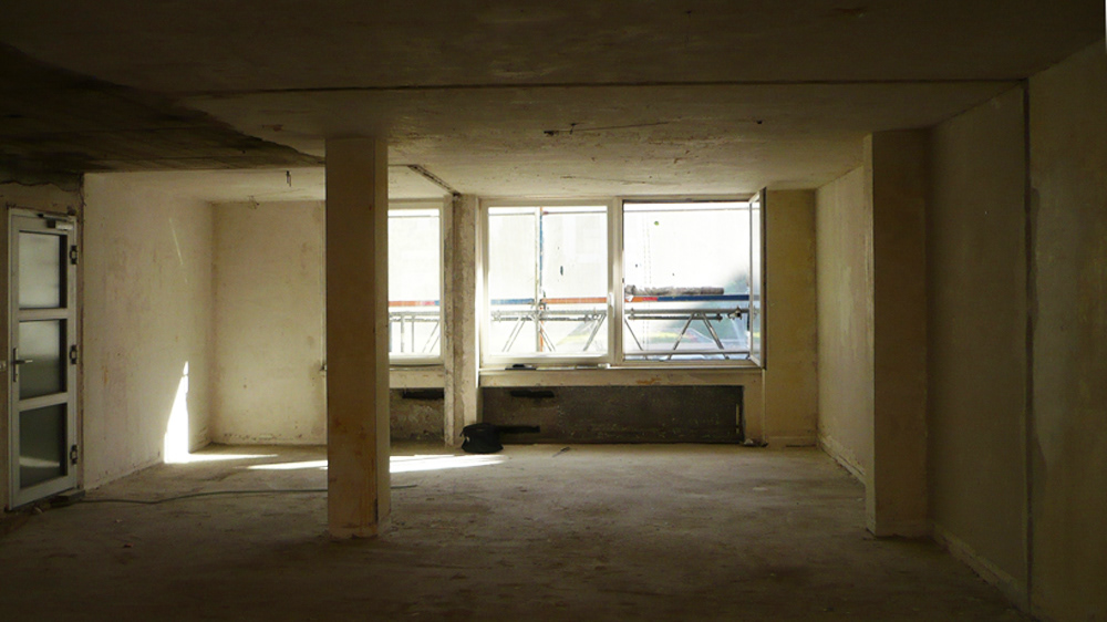 Die Räume des Bestandsgebäudes waren durch die ausschließliche Belichtung über eine kleinteilige Lochfassade extrem dunkel. Durch den Rückbau von Fassadenteilen und der Neuausrichtung der Struktur an einer Enfilade sind die Räume nun Licht durchflutet. Auch in der Außenfassadengestaltung wird die Längsausrichtung des Bestandsgebäudes zum Entwurfsbestandteil. Die Abfolge der Räume wird durch das fein abgestufte Farbkonzept im Fensterband unterstrichen. Das Farbkonzept sieht vor, alle Räume mit einem eigenen Farbton zu versehen und somit die Orientierung zu vereinfachen. Die Raumabfolge zoniert sich vom dunkel gehaltenen zentralen Eingangsbereich zu den immer heller werdenden WC- Räumen. Die Farbtöne finden sich in den Leibungsverkleidungen, den Türblättern und teilweise an den Fliesenflächen. Alle Aspekte des barrierefreien Bauens und der Behindertengerechtigkeit wurden berücksichtigt.