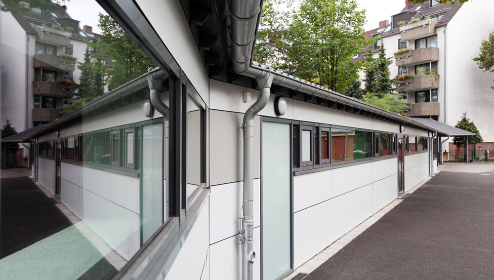 Neubau einer Mensa inkl. Küche und Büro zwischen zwei Bestandsgebäude auf der Hoffläche der Grundschule in der Leuchterstraße in Köln Dünnwald