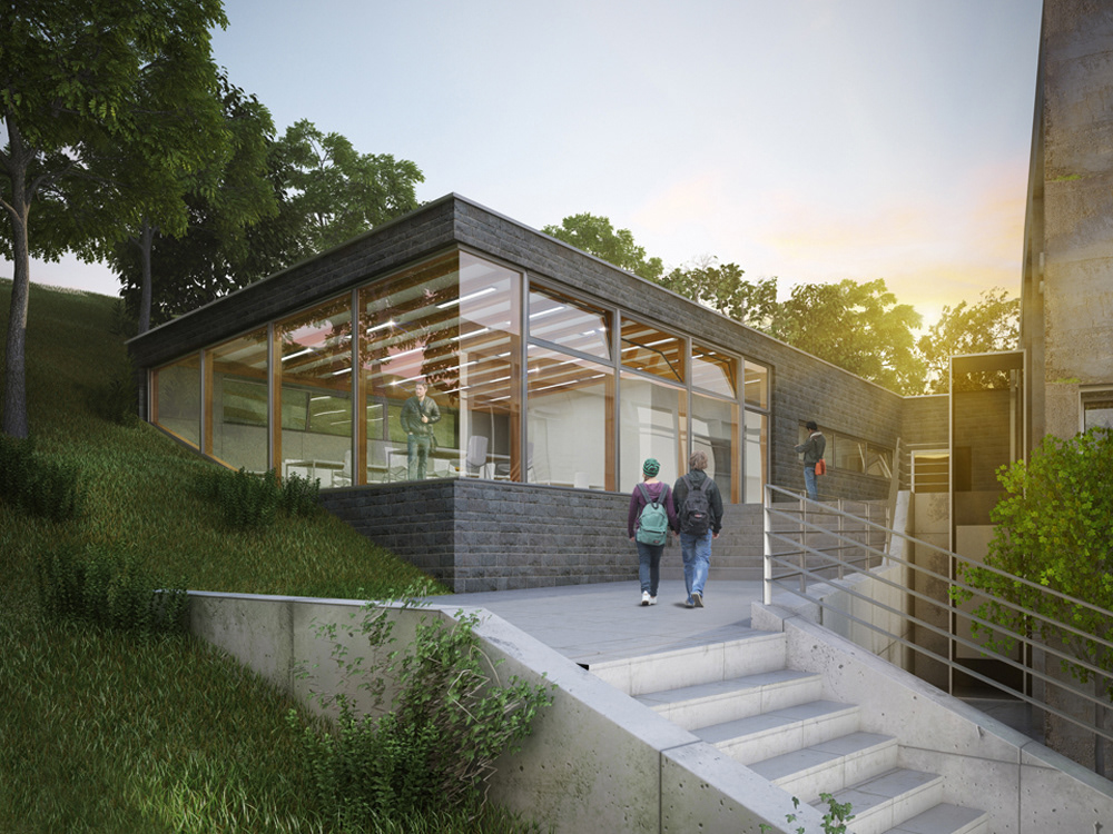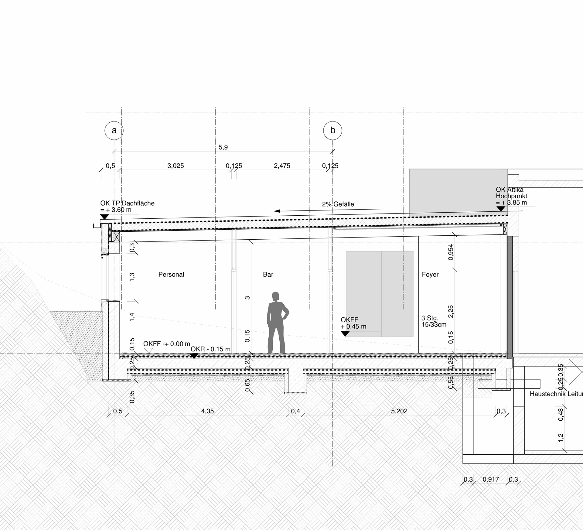 Der Neubau wird somit in Hanglage direkt neben der Aula des bestehenden Gebäudes angeordnet. Durch die direkte Anbindung des Neubaus an den Bestand ergeben sich funktional sinnvolle Synergieeffekte. Die gewünschte Mehrfachnutzung als Pausenschülertheke, Theaterbar, Mensa und Vortragsraum wird so inkl. der dafür notwendigen Technik im Neubau umgesetzt. Die Fassadengestaltung und die Aufteilung der Fensterflächen entwickeln sich konsequent aus der Nutzung der dahinterliegenden Räume. Die Nebenräume werden hangseitig angeordnet. Durch das Eingraben des Gebäudes und den gewählten rohen Materialien wie Schiefer, Sichtbeton, Sichtestrich und dem Einsatz einer sichtbaren Holzbalkendecke wird sich der Besucher des Raums der Hanglage auch im Innenraum bewusst.